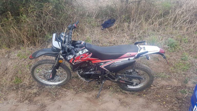 donde visibilizaron una motocicleta tirada entro los pastizales, cubierta por ramas y una campera azul.