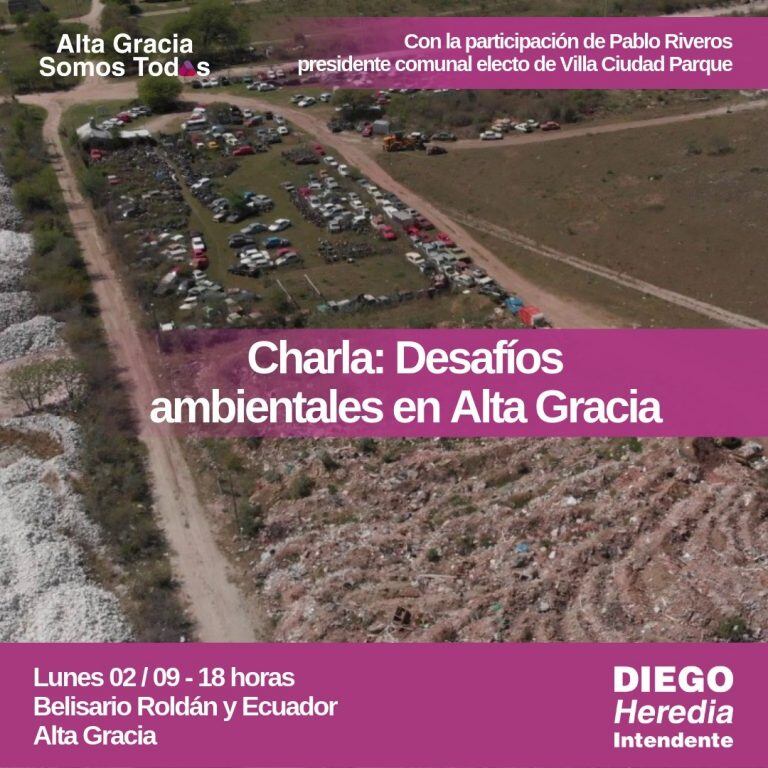 Alta Gracia Somos Todxs realizará la charla debate "Desafíos ambientales en Alta Gracia y la región". La misma se desarrollará el próximo lunes 2 de septiembre a las 18 horas, y contará con la presencia del jefe comunal electo de Villa Ciudad Parque, Pablo Riveros.