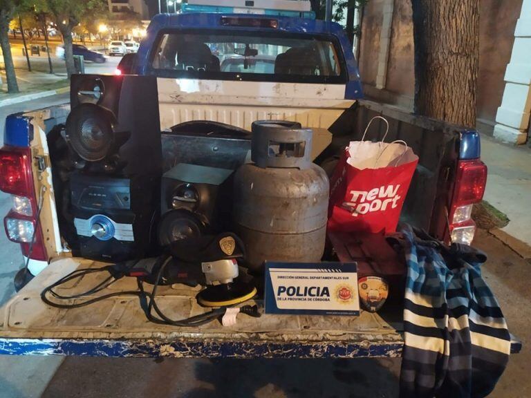 Se recuperaron todos los elementos robados. Una garrafa de 10 kg, una amoladora con disco circular de pulir, un equipo de música con sus dos parlantes, una caja de herramientas y una bolsa con varias prendas.