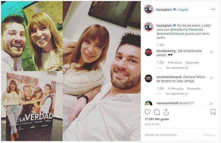 Alturria publicó una foto con Lizy en su red social y ella hizo lo mismo. "Noche de teatro con la hermosa de @lizytagliani y salió cena", dijo él. "Noche de teatro y salió cena con @leoalturria #laverdad @recoletasilverpub gracias por tanto cariño", dijo ella.
