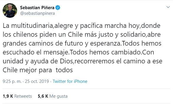 "La multitudinaria, alegre y pacífica marcha hoy, donde los chilenos piden un Chile más justo y solidario, abre grandes caminos de futuro y esperanza", dijo Piñera en su cuenta de Twitter en referencia a la manifestación de Santiago, la más multitudinaria en décadas.