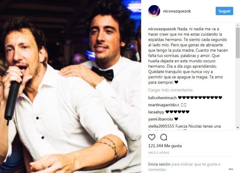 A casi ocho meses de la muerte de su hermano Santiago, Nico Vázquez decidió hacer un post emotivo en su cuenta de Instagram.