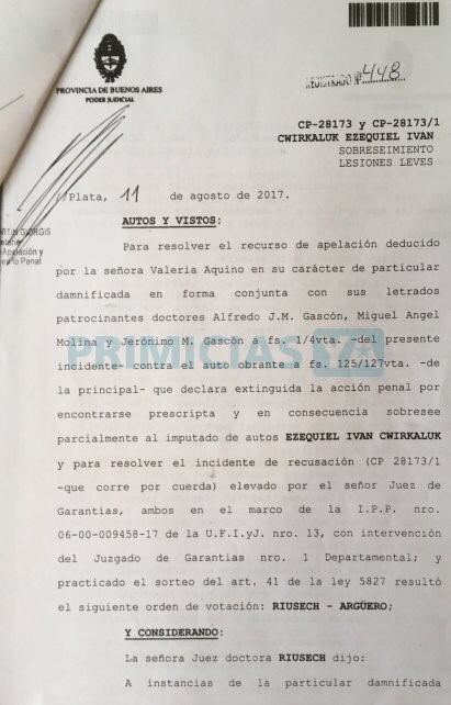 En un fallo unánime, los Jueces Ruisech y Arguero hicieron lugar al recurso presentado por los abogados Alfredo Gascón, Miguel Ángel Molina y Jerónimo Gascón y consideraron que las agresiones del Polaco contra quien fuera su pareja, Valeria Aquino, fueron propinadas en el marco de la violencia de género, "en un contexto en que Aquino no aparece en situación de igualdad con Cwirkaluk", dijeron los jueces, enfatizando la preeminencia del Polaco sobre Valeria.