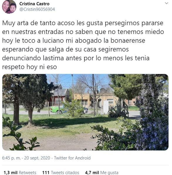 "Muy harta de tanto acoso, les gusta perseguirnos, pararse en nuestras entradas, no saben que no tenemos miedo, hoy le tocó a Luciano, mi abogado, la bonaerense esperando que salga de su casa. Seguiremos denunciando, lástima antes por lo menos les tenía respeto, hoy ni eso", escribió la mujer junto a una foto de la camioneta policial.