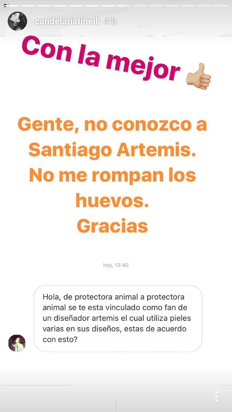 Candelaria -defensora nata de los animales- escribió unas líneas en Instagram para aclarar el tema. "Gente, no conozco a Santiago Artemis. No me rompan los huevos. Gracias.", escribió la it girl.
