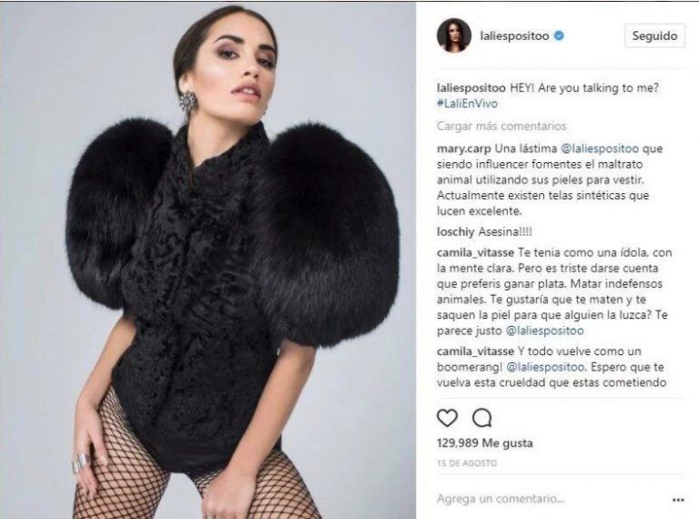 Escracharon a Lali Espósito por una foto que publicó en Instagram hace un mes en donde está usando un un tapado de piel de Santiago Artemis, un joven diseñador argentino que comenzó a tomar notoriedad por vestir a famosas como Griselda Siciliani y Charlotte Caniggia.