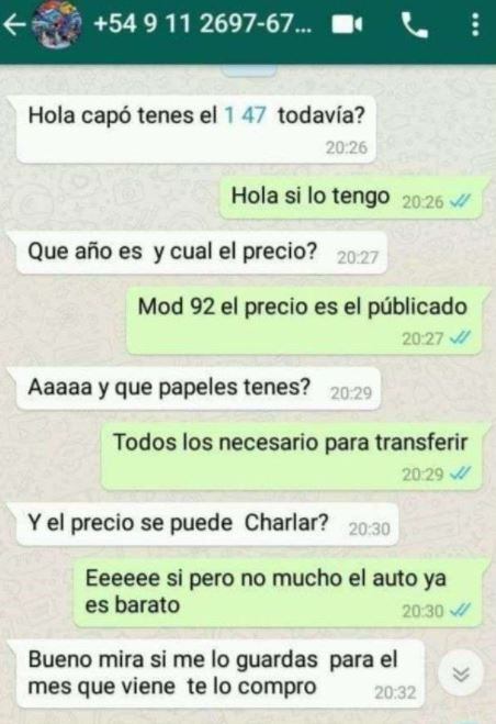 A la hora de realizar una compra por Internet, uno se puede encontrar con todo tipo de situaciones. Pero seguramente pocas tan insólitas como ésta: en las últimas horas se viralizó una increíble discusión vía WhattsApp por la venta de un automóvil.