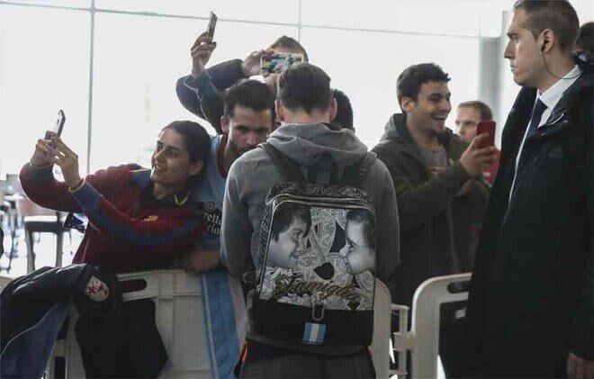 La "Pulga" firmó algunos autógrafos y se sacó fotos con los fanáticos, cuando algunos se percataron de que tenía puesta una mochila muy particular.