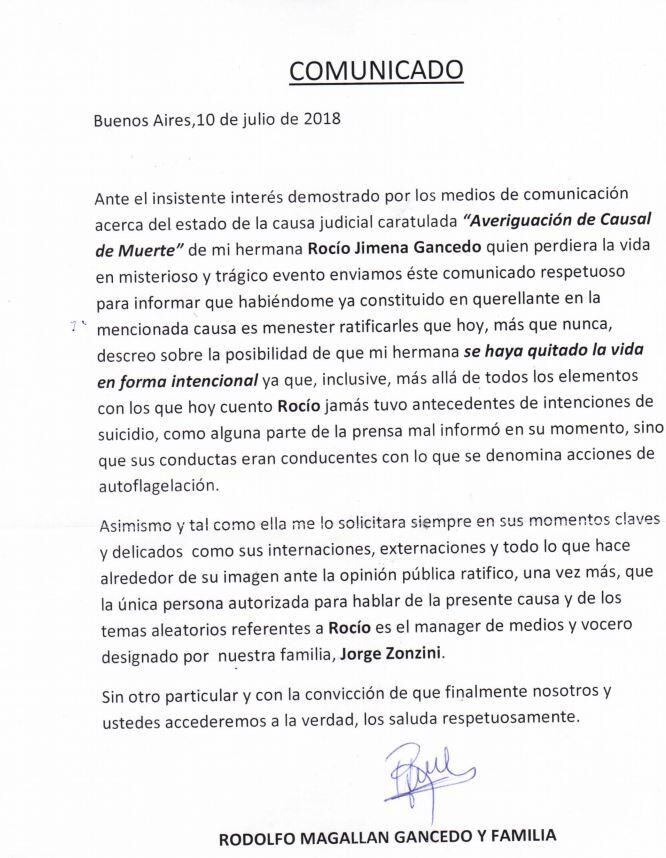 El hermano de Rocío, Rodolfo Magallán, emitió un comunicado y difundió las fotos que muestran cómo estaba su casa antes de la muerte. Además, expresó su "convicción" de que finalmente se "acceda a la verdad". La familia también difundió las imágenes que son parte de la investigación por "averiguación de causal de muerte".