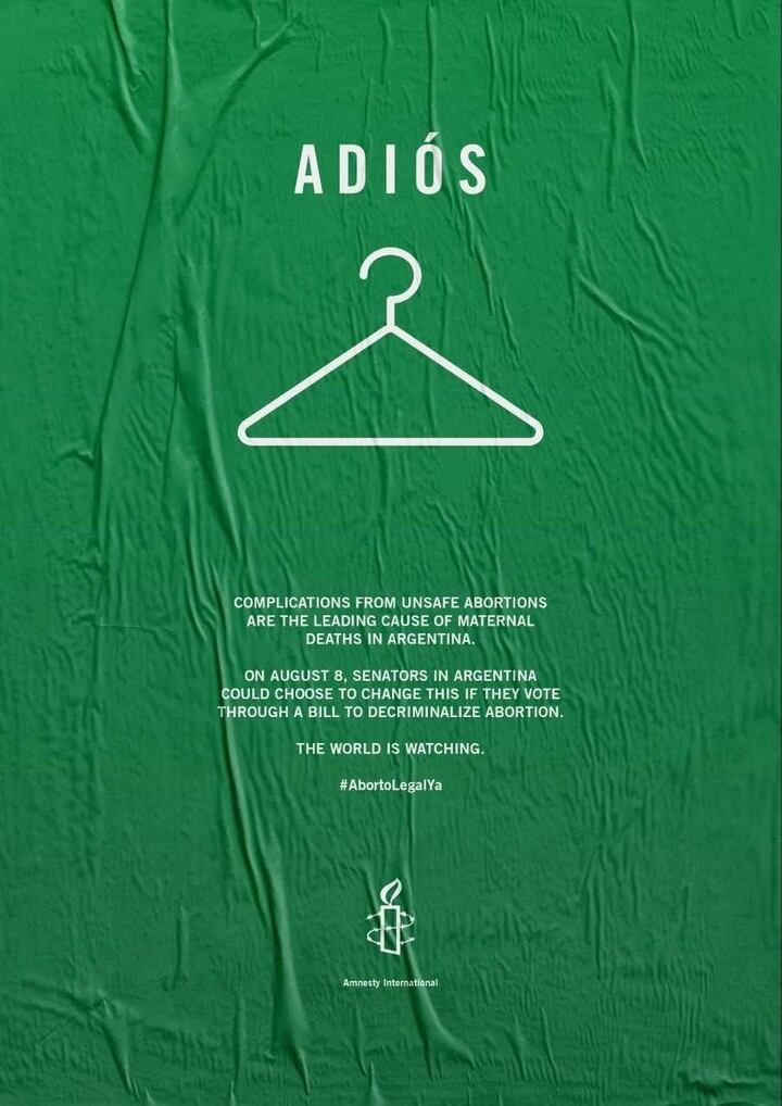 Esta semana, la ONG publicó un anuncio a favor de la despenalización en la contratapa del diario The New York Times. A página completa, con fondo verde, se leía en mayúsculas la palabra ADIÓS, una imagen de una percha (símbolo asociado a abortos inseguros y clandestinos) y la frase en inglés: "Las complicaciones por abortos inseguros son la principal causa de muerte materna en la Argentina. El 8 de agosto, los senadores pueden elegir cambiar esto si votan a favor de una ley que despenaliza el aborto. El mundo los está mirando". El mensaje cierra con el hashtag en español #AbortoLegalYa.