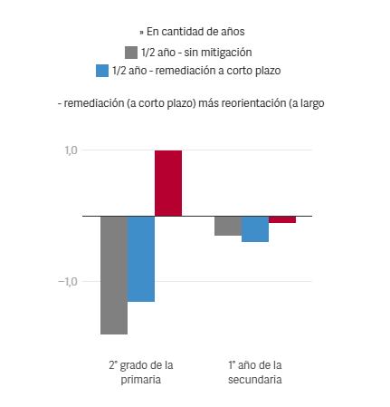 No obstante, si los mismos estudiantes tuvieran una remediación a corto plazo perderán 1,3 años de aprendizajes a futuro. Mientras que si se aplica una estrategia de reorientación a largo plazo, los estudiantes ganarán un año de aprendizaje comparado a lo que hubiera pasado sin pandemia.