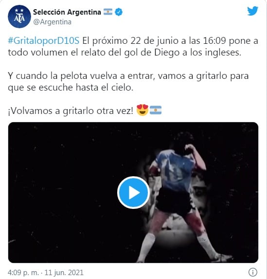 La consigna #GritaloporD10S, iniciada por la AFA, invita a que este martes, más precisamente a las 16:09 (horario en el que Diego convirtió su tanto en el Estadio Azteca) todos y todas pongan en sus casas, o donde estén, el mítico relato de Víctor Hugo Morales para festejar.