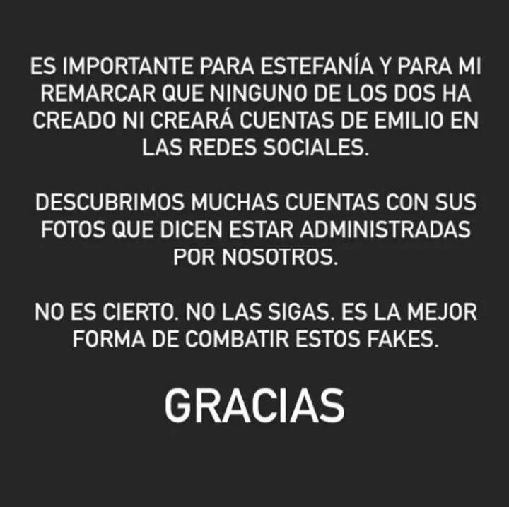 “Es importante para Estefanía y para mí remarcar que ninguno de los dos ha creado ni creará cuentas de Emilio en las redes sociales”, empezó con su escrito a través de sus historias.