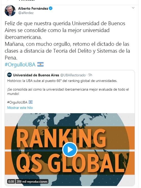 "Feliz de que nuestra querida UBA se consolide como la mejor universidad iberoamericana", expresó el mandatario en su cuenta de Twitter.