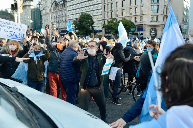 Justamente, para manifestarse contra el Gobierno nacional miles de personas violaron la cuarentena y se acercaron al Obelisco. Se los podía ver con barbijos y máscaras faciales. Pero en un momento la situación se descontroló, hubo momentos de mucha tensión, y el distanciamiento social se suprimió. No hubo agentes de la Policía en el lugar.