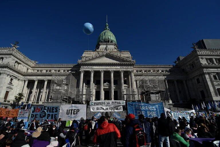Luego de suspender la movilización en la inauguración de La Rural por “amenazas e insultos”, Somos Barrios de Pie se manifiesta frente al Congreso de la Nación para mostrar su descontento con el campo y su “proceso de especulación”.