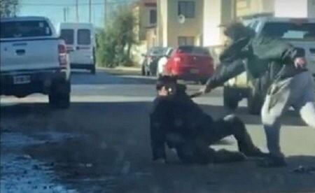 Primero el sujeto le tira las botellas que no logran impactar en Roli, luego se trenzan en lucha, del video al que accedió truncadoinforma se puede observar como el malviviente dos veces le pasa por el cuello un cuchillo de grandes dimensiones tipo carnicero que no logran cortarlo porque la víctima estaba protegido por la campera.
