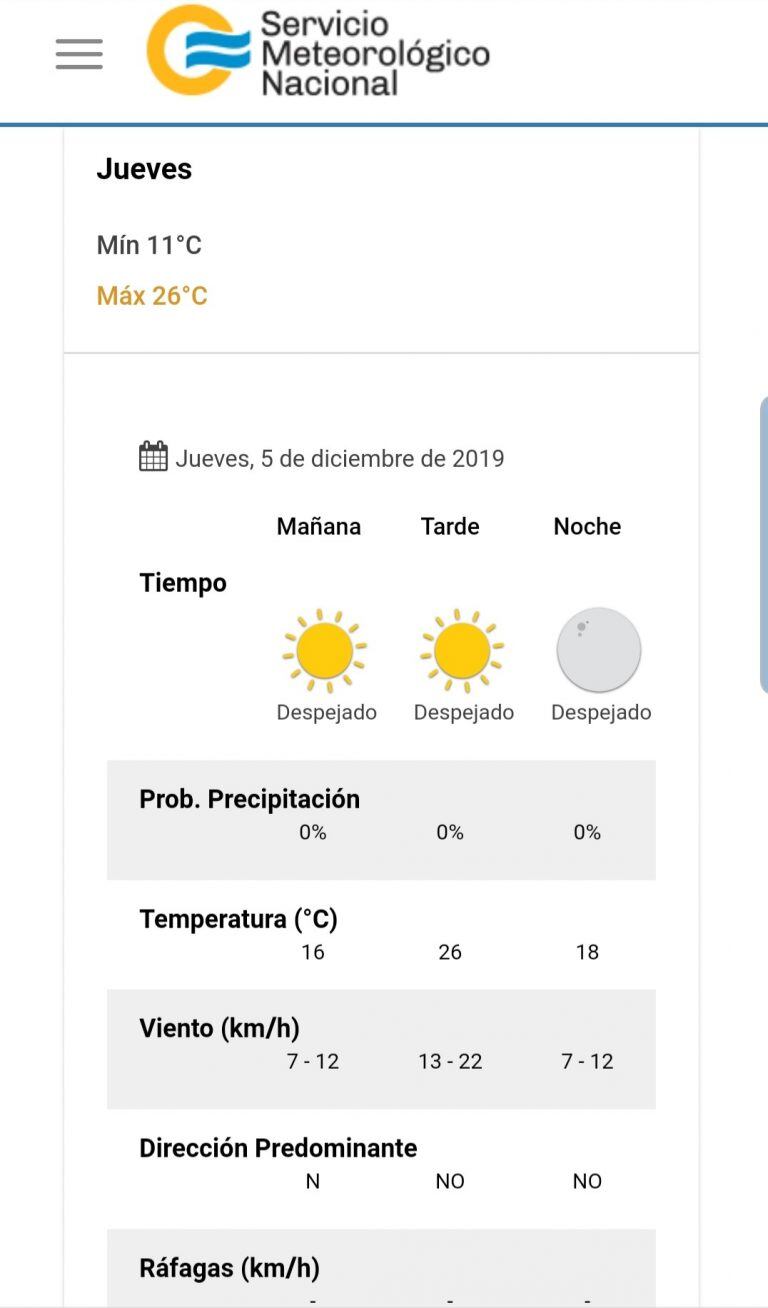 De acuerdo al Servicio Meteorológico Nacional (SMN), la ciudad y toda la región céntrica del país, vivirá un jueves soleado, absolutamente despejado. Además, con una humedad del 67 por ciento, y vientos que soplarán desde el sector norte rotando hacia el noroeste.