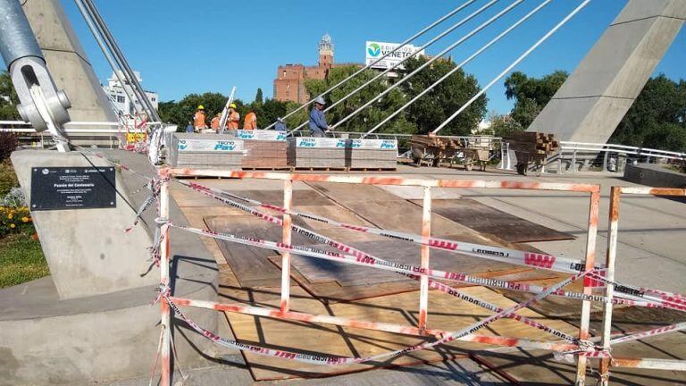 Desde la mañana de este martes se puede observar a empleados municipales colocando adoquines en el nuevo puente peatonal "Cetenario".