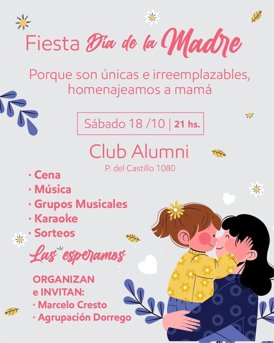 El próximo viernes 18 de octubre, a las 21 horas, se realizará una gran cena show en homenaje a las madres en el Club Alumni, ubicado en Castillo 1080, Concordia.Bajo el lema “Porque son únicas e irreemplazables, homenajeamos a mamá”, la propuesta invita a compartir una noche llena de alegría, música y emoción.