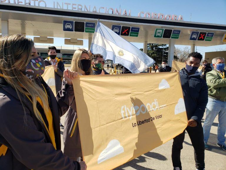 Son empleados de las firmas Flybondi y Jetsmart, que con carteles y banderas manifestaron un deseo en común: "queremos volver a volar", expresaron en el acceso principal del Aeropuerto Ambrosio Taravella.