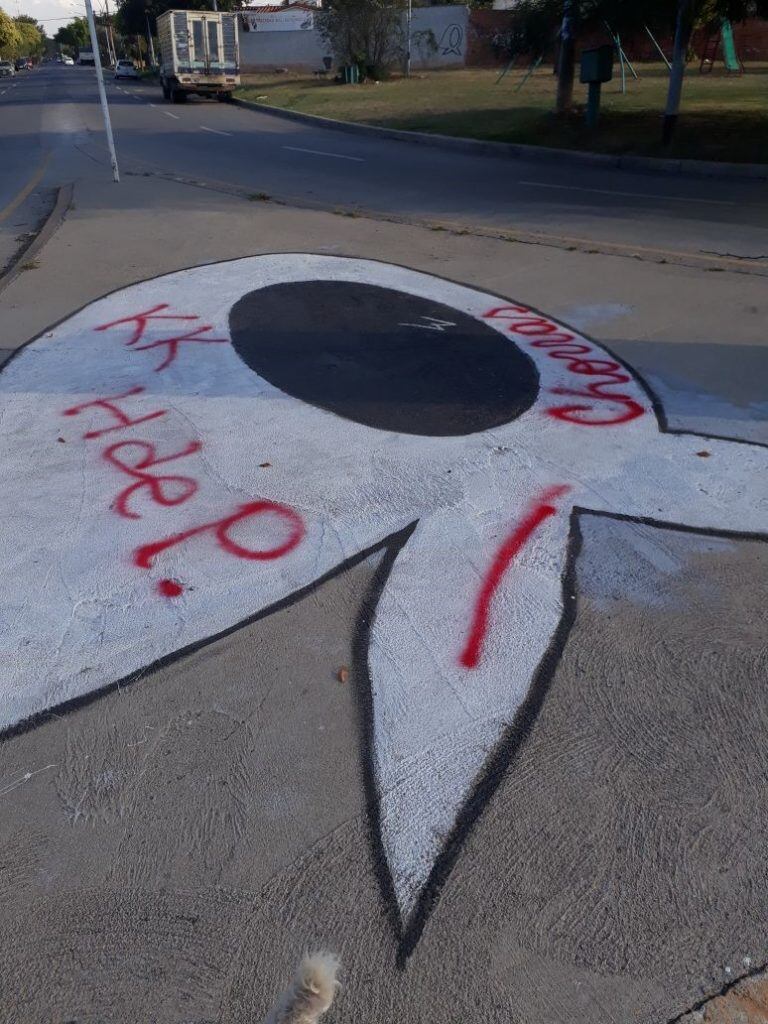 Un enorme pañuelo blanco pintado en homenaje a Abuelas de Plaza de Mayo fue atacado en distintas oportunidades con pinturas agresivas, y ante esto se lanzó en las redes sociales una invitación a la comunidad para repararlo, como un mensaje para mantener viva la memoria.