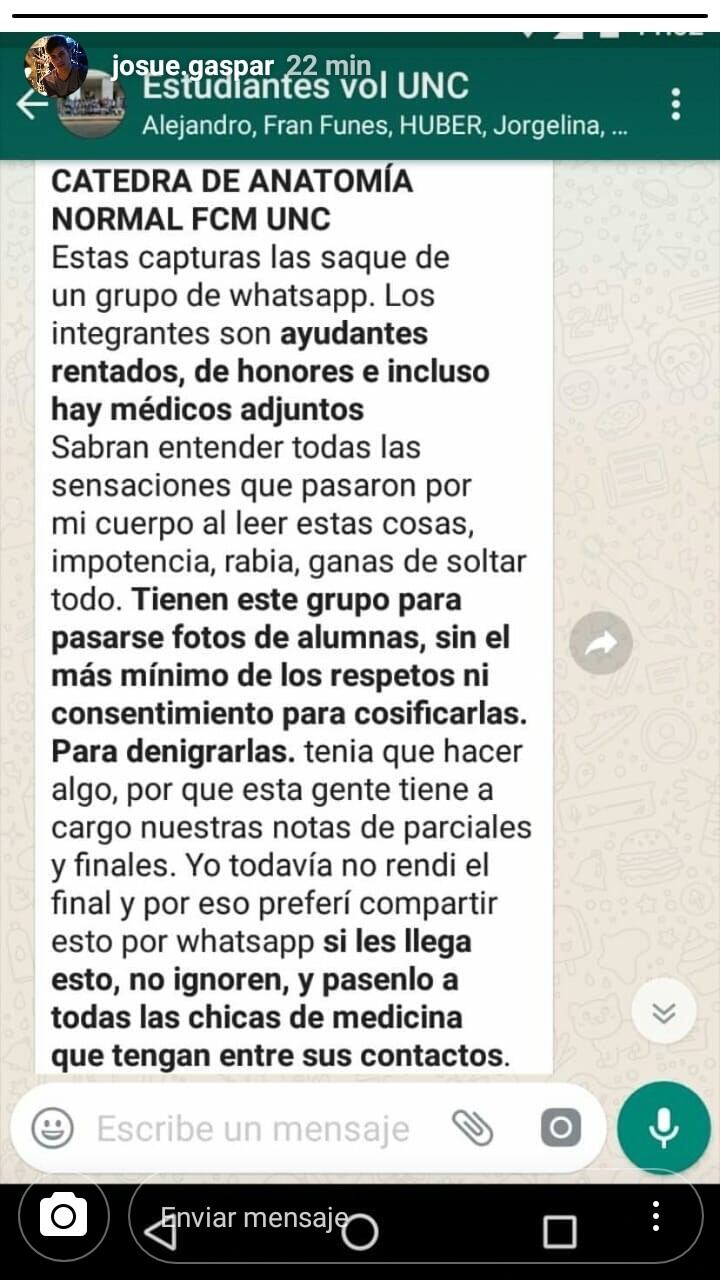 El rector de la Universidad Nacional de Córdoba, Hugo Juri, confirmó este martes que presentará una denuncia en la Justicia federal por los chats misóginos de Whatsapp aparecidos presuntamente en un grupo cerrado de profesores y ayudantes de la cátedra de Anatomía Normal de la Facultad de Ciencias Médicas y que afectaban directamente a las alumnas que tenían a cargo.