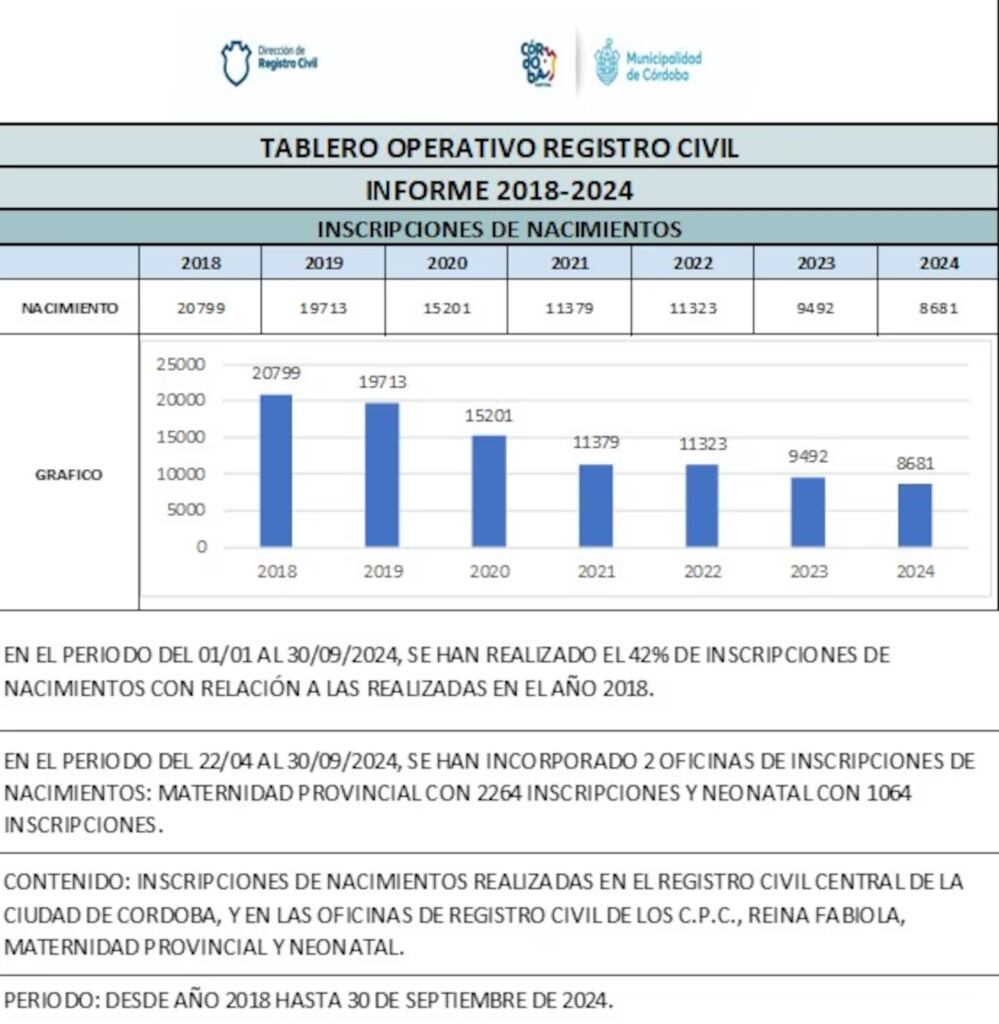 Según detalló el Registro Civil de la ciudad de Córdoba, la inscripción de nacimientos en lo que va del 2024 cayó a 8.681. En 2018, esa misma categoría rozaba los 20.800 registros de recién nacidos; es decir, una baja del 41,73 por ciento.