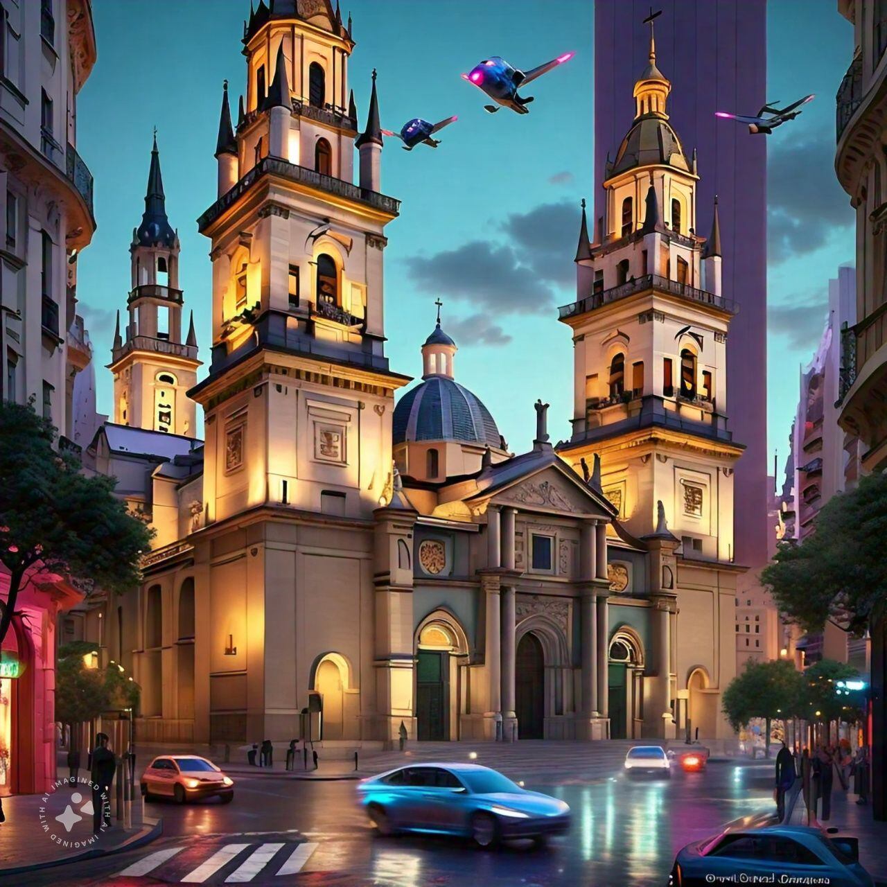 La primera imagen que arrojó la IA fue la de la Catedral de Córdoba, con una estructura mucho más extendida y con la posibilidad de que los autos accedan por el frente del monumento. Alrededor, mucha más construcción en altura.