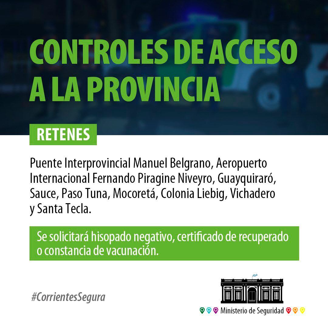 La documentación que solicita el personal policial y de salud pública correntino será: Testeo PCR o antígeno; Certificado de vacunación; Alta epidemiológica.