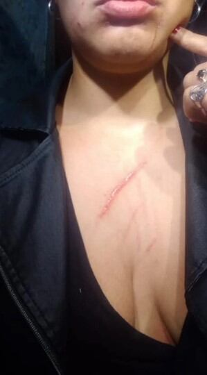 “Esto me pasó a la salida del boliche. Mi ex marido, el jefe de Tránsito, Mario de Jesús Rodríguez, y su mujer, Lorena Aguayo, sin ningún motivo me tiran cascotes para tirarme de la moto, lo cual lograron, para luego prenderse por mí como esos animales”, escribió Florencia.