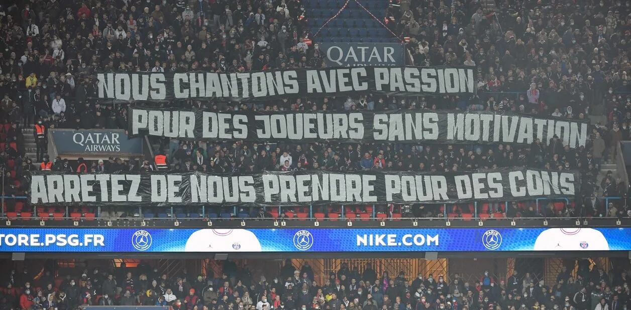 Durante el encuentro, se hicieron presentes banderas en contra de la dirigencia del PSG, además de abucheos a los jugadores.