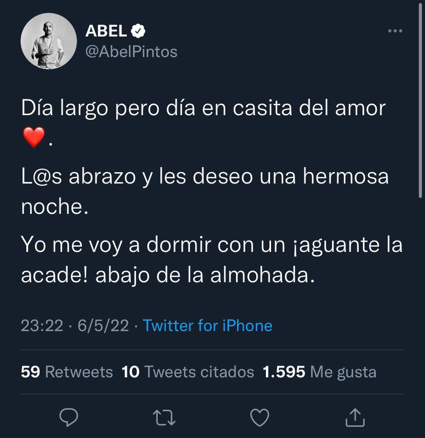 Abel, también demostró su amor por Racing el viernes pasado. Tras que su equipo asegure el primer puesto de su zona, también expresó en Twitter: “Yo me voy a dormir con un ¡aguante la acade! abajo de la almohada”.