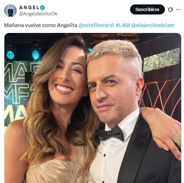 Después de hacer el anuncio oficial mediante la pantalla chica, Ángel de Brito compartió una fotografía junto a Estefi Berardi en X y, al pie de la misma, remarcó lo que había comunicado previamente en el programa de entretenimientos que conduce en América TV.