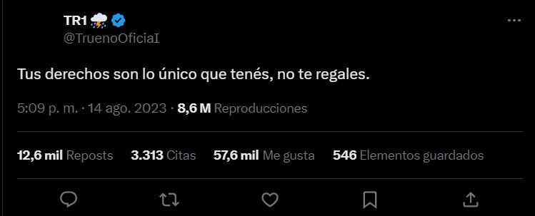 El rapero Trueno compartió el lunes un poderoso mensaje:”tus derechos son lo único que tenés, no te regales”, haciendo referencia al desenlace de las elecciones del domingo, donde el candidato de La Libertad Avanza (LLA), Javier Milei, emergió como el favorito con el 30.04% de los votos.