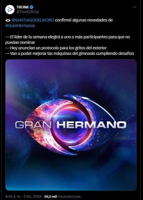 El conductor del programa reveló en el primer programa los cambios que hicieron en el reality en referencia a algunos desafíos. “El líder de la semana elegirá a uno o más participantes para que no puedan nominar”, informó la cuenta de X @TronkOficial.