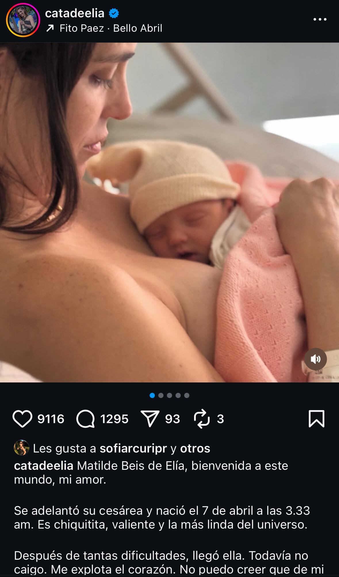 “Matilde Beis de Elía, bienvenida a este mundo, mi amor. Se adelantó su cesárea y nació el 7 de abril a las 3.33 am. Es chiquitita, valiente y la más linda del universo. Después de tantas dificultades, llegó ella. Todavía no caigo. Me explota el corazón. No puedo creer que de mi cuerpo, y del amor con Nico, haya salido esta belleza”, comenzó, en un posteo de Instagram.