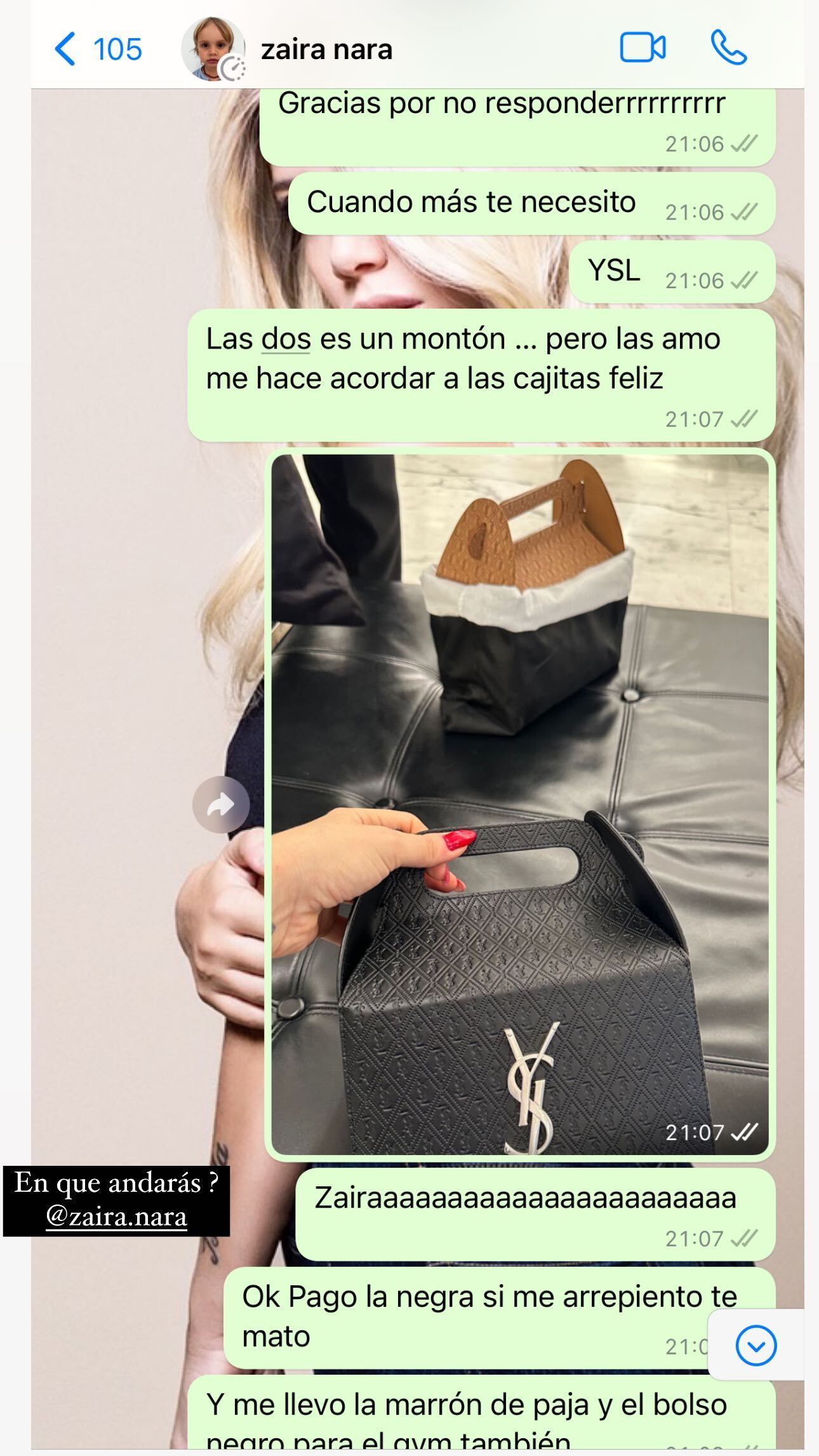 “Gracias por no responder cuando más te necesito” se ve en la foto del chat con Zaira, dejando en claro que ya le escribió antes y no obtuvo respuesta. “Las dos son un montón... pero las amo, me hacen acordar a las Cajitas Feliz”, siguió escribiendo Wanda junto a una imagen de las carteras.
