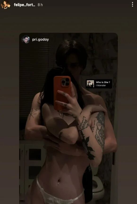 Se trató de una foto frente al espejo en la que posó el hijo de Ricardo Fort junto a su novia, Priscila Godoy. A ella se la puede ver en tanga y sin corpiño, mientras él la abraza de atrás, sin remera.