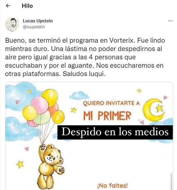 Por Twitter llegó también la despedida de Lucas Upstein, conductor de “No tenemos todo el día”. “Bueno, se terminó el programa en Vorterix. Fue lindo mientras duró. Una lástima no poder despedirnos al aire pero igual gracias a las 4 personas que escuchaban y por el aguante. Nos escucharemos en otras plataformas. Saludos luqui”, disparó ácido.