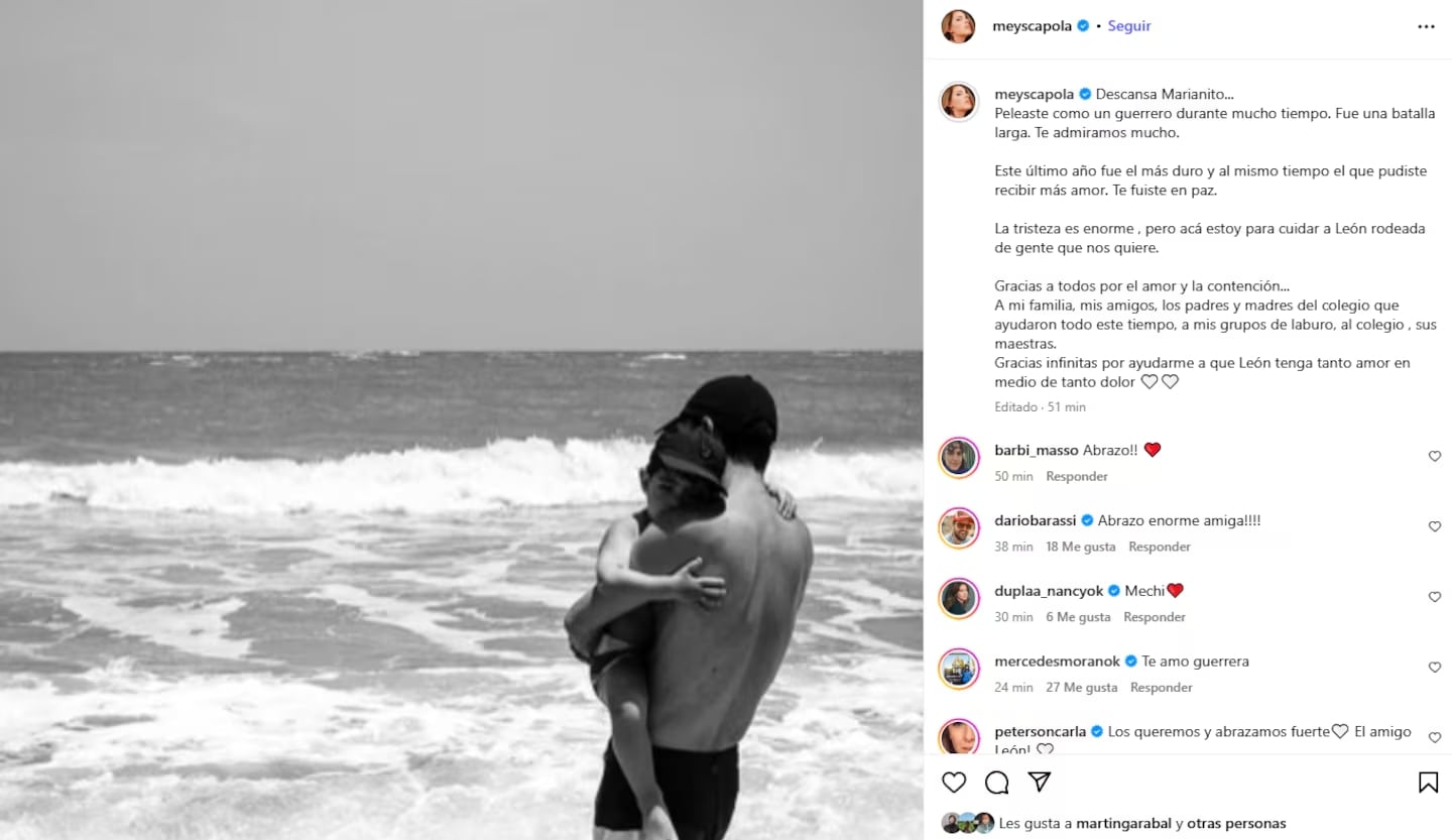 “Te fuiste en paz. La tristeza es enorme, pero acá estoy para cuidar a León rodeada de gente que nos quiere. Gracias a todos por el amor y la contención...”, agregó con emoción Mey Scápola.