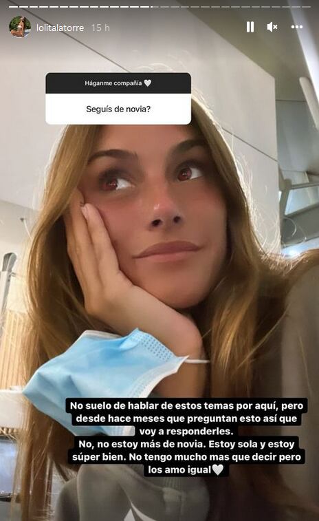Luego reveló: “No, no estoy más de novia. Estoy sola y estoy súper bien. No tengo mucho más que decir pero los amo igual”.