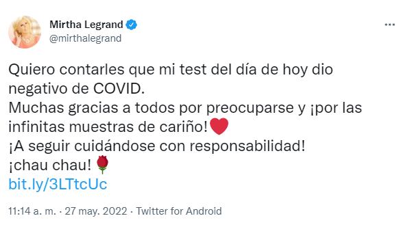 A través de Twitter e Instagram, la Diva de los almuerzos confirmó: “Quiero contarle que mi test de día de hoy dio negativo de COVID. Muchas gracias a todos por preocuparse y ¡por las infinitas muestras de cariño!”.