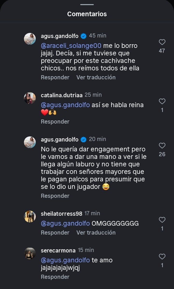 El clip se hizo viral en cuestión de minutos y esto llevó a que Agustina Gandolfo, esposa del futbolista, le publicara varios mensajes sobre este tema a la “fanática” de Lautaro. Agus Gandolfo comentó la publicación a Agus Kogan, acusándola de que “hombres mayores” le pagan los palcos de las canchas mientras ella se hace pasar por la amante de su marido.