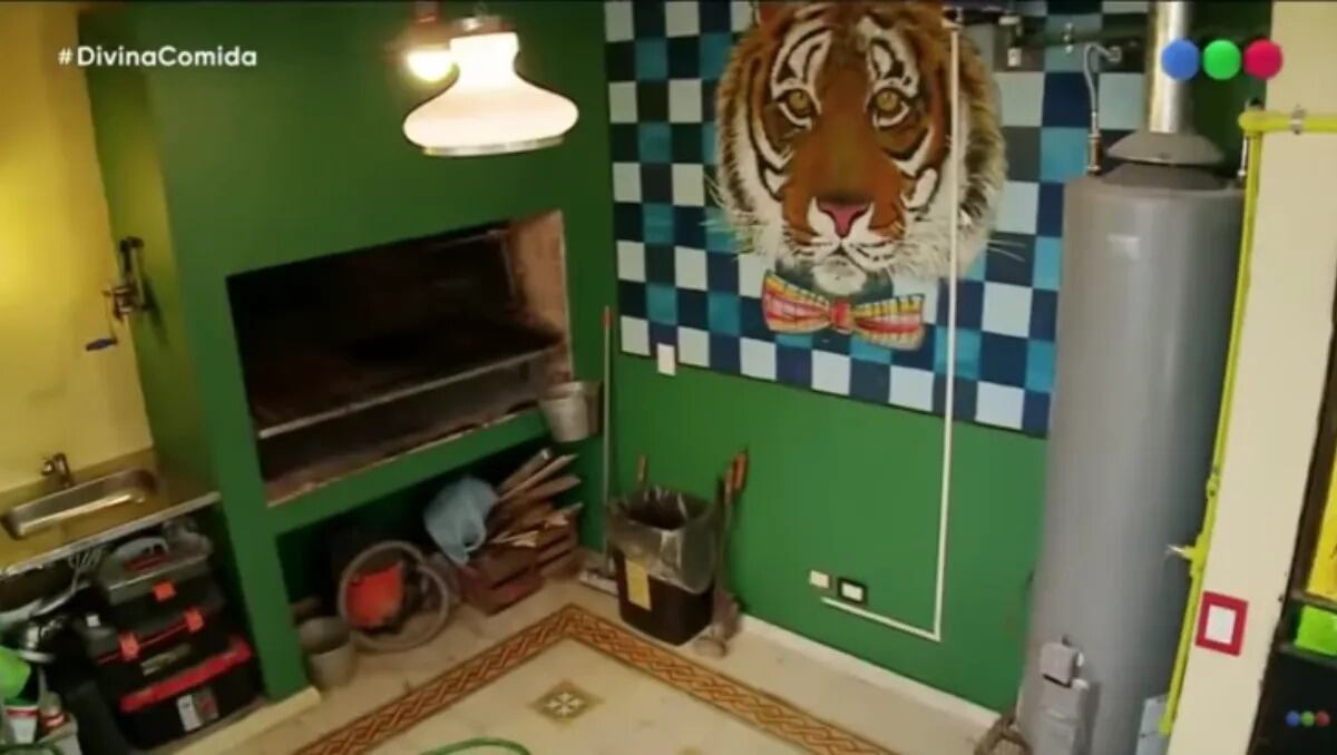 Al subir las escaleras que son de madera y pintadas en marrón se accede a la terraza, lo primero que se ve al llegar es un mural en donde está pintado un tigre gigante, al lado la chimenea y una mesada en color verde.