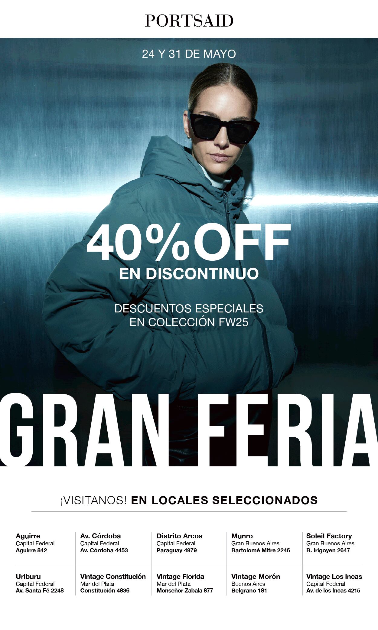 Portsaid cuenta con 10 locales de outlet en diferentes puntos de la provincia de Buenos Aires. En cada uno de ellos habrá productos, especialmente abrigos, en discontinuo con 40% de descuento con diferentes medios de pago.