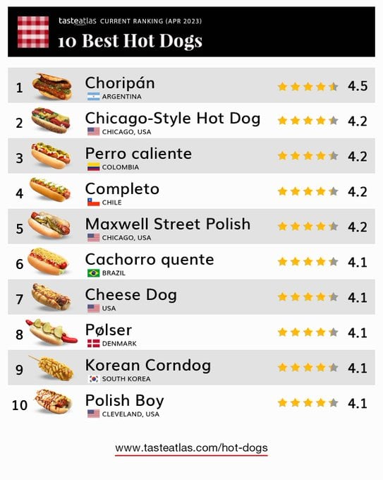En segundo lugar se ubicó el Chicago Style Hot Dog de Chicago, Estados Unidos con 4.2 puntos y completó el podio el Perro caliente colombiano con 4.2 puntos. A principios de marzo, el choripan había calificado séptimo en la categoría de “mejor sándwiches del mundo” del mismo portal.