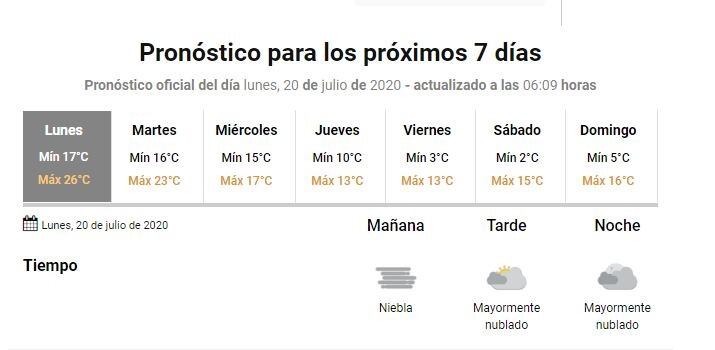 Lunes 20/07: Mayormente nublado. Máx 26º - Mín 17º