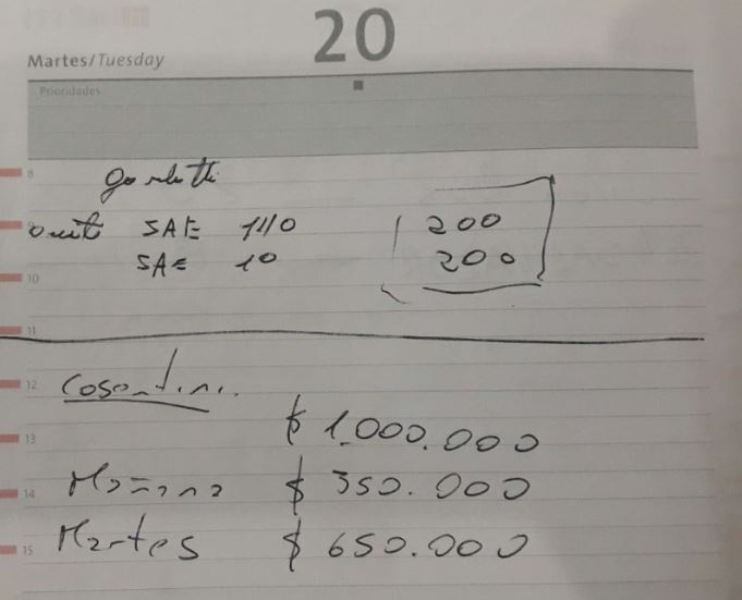 Siempre según la denuncia de Agostini, en las páginas de las agendas figuran desde "dibujos con diseños de camisetas para la campaña política de un candidato, el día que debían entregarse y la cantidad que se tenían que imprimir, el dinero que debía entregar ´Cosentini´, léase Luis Cosentini, quien era presidente del Instituto de Viviendas y Urbanismo de Jujuy", escribió la periodista, que se considera víctima de Sala.