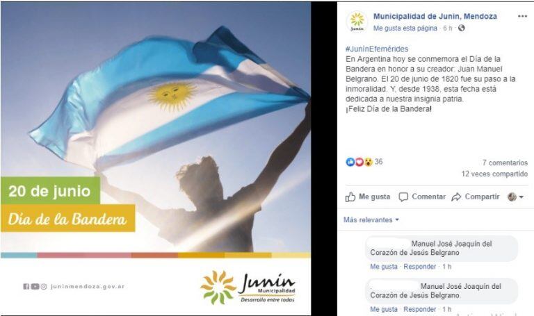 ¡Feliz Día de la Bandera! pic.twitter.com/Z4bbjlQT3l — Municipalidad de Junín (@MuniJuninMdz) 20 de junio de 2019 Uno de ellos, vinculado al nombre del prócer argentino, a quien rebautizaron como "Juan Manuel" Belgrano cuando en realidad su nombre completo es Manuel José Joaquín del Corazón de Jesús Belgrano.